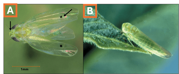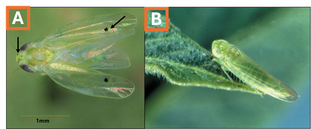 Figure 1. Cotton jassid adults (A) have one black dot on each wing and may have two small dots between their eyes (these dots on the crown can fade). The potato leafhopper (B), which is not a threat to cotton production but does occur in Oklahoma, does not have black dots on their wings or between their eyes. Image A courtesy of Isaac Esquivel, UF Extension, image B courtesy of DryBeanAgronomy.ca.