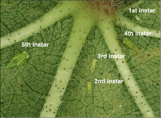 - Reproduction: Eggs are inserted directly into leaf midveins and petioles, hatching in 3–4 days. Eggs will not be visible to the naked eye or through hand lens. Cotton jassids progress through 5 nymphal instars before becoming reproductive adults (Figure 2).
