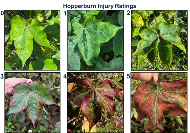 A Hopperburn Injury Rating Scale has been developed by Extension Cotton Entomologists in the mid-South (Figure 3). You cannot let the cotton jassid get ahead of you. Once reddening starts on the leaf margins (Rating 2 in Figure 3) it is likely too late to rescue the cotton plant, damage will quickly progress and photosynthetic capabilities for the plant decline considerably.