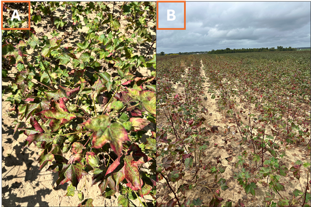 Figure 4. Cotton jassid hopperburn resulting in reddened, dried leaves (A) and stunted cotton plants (B). Image courtesy Isaac Esquivel, UF Extension.