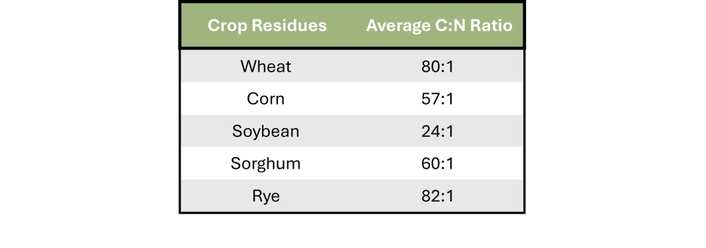 Table 1 provides approximate C:N ratios for several crops commonly grown in Oklahoma. When additional carbon is introduced into these systems without accompanying nitrogen, the likelihood of microbial immobilization increases. While immobilization is not bad, it does create a question mark as Oklahoma’s variable climate means the following release of nutrients will be unpredictable.