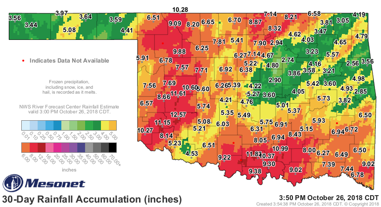 30 Day rainfall totals retrieved from Mesonet on 10.26.18. Putting recording window from Sept 26-Oct 26. http://www.mesonet.org/index.php/weather/category/rainfall