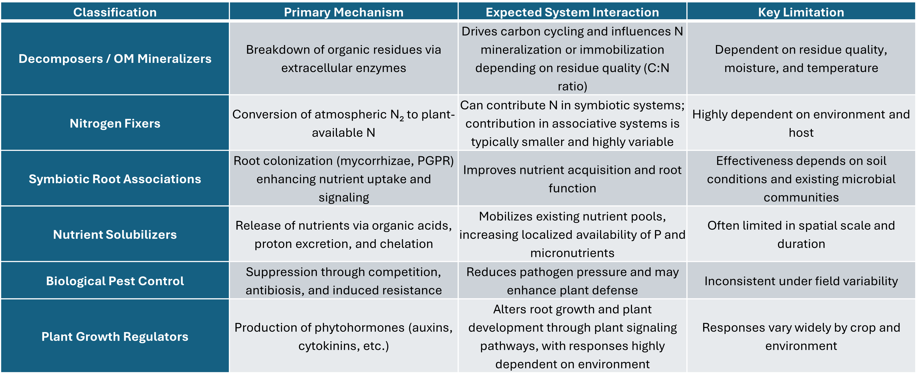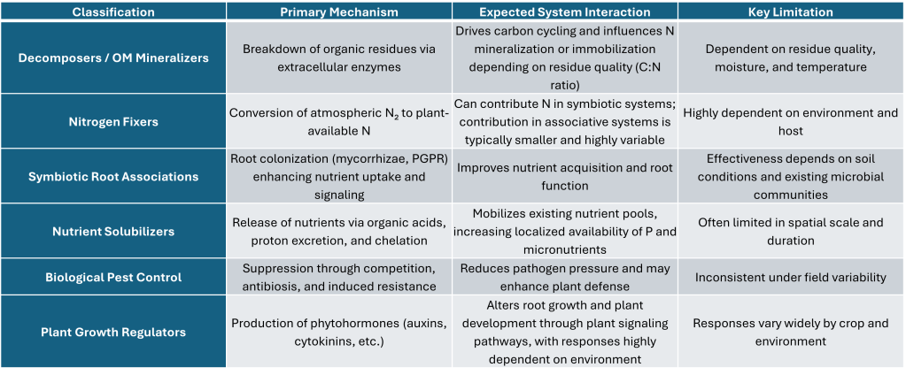 - The presence of a biological function does not guarantee a yield response, outcomes are driven by soil, crop, and environmental conditions