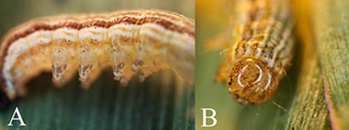 Figure 2. True armyworm. A) Dark band on prolegs. B) Orange head capsule with dark net-like pattern. Photos by Adam Varenhorst, Iowa State University Extension.