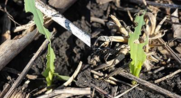 Figure 3. True armyworm feeding on young corn plant. Photo by Adam Varenhorst, Iowa State University Extension.