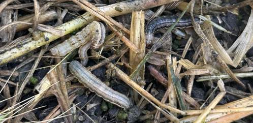 True armyworm is generally easier to control with pyrethroids than fall armyworm. Ensure high-volume water (10-15 GPA ground) is used to get the product into the whorl or canopy where the larvae hide. Remember that most insecticides work via contact; if true armyworm larvae are feeding or hiding under dense residue, insecticides are unlikely to make contact and are ineffective. Target applications when larvae are actively feeding on foliage to ensure good contact. Follow all instructions on the insecticide label to ensure good control.