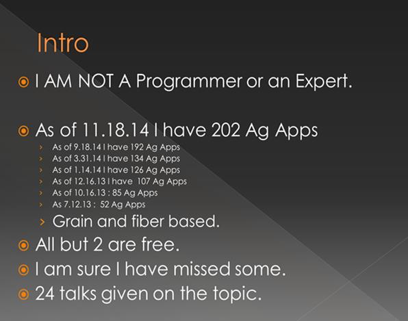 Since the meeting I have had numerous request for the slides and etc, so I thought this would be a good opportunity for a blog. Since InfoAg (7.17.2013) I have picked up even more apps, the total is now 76. However many of the new apps require registration.