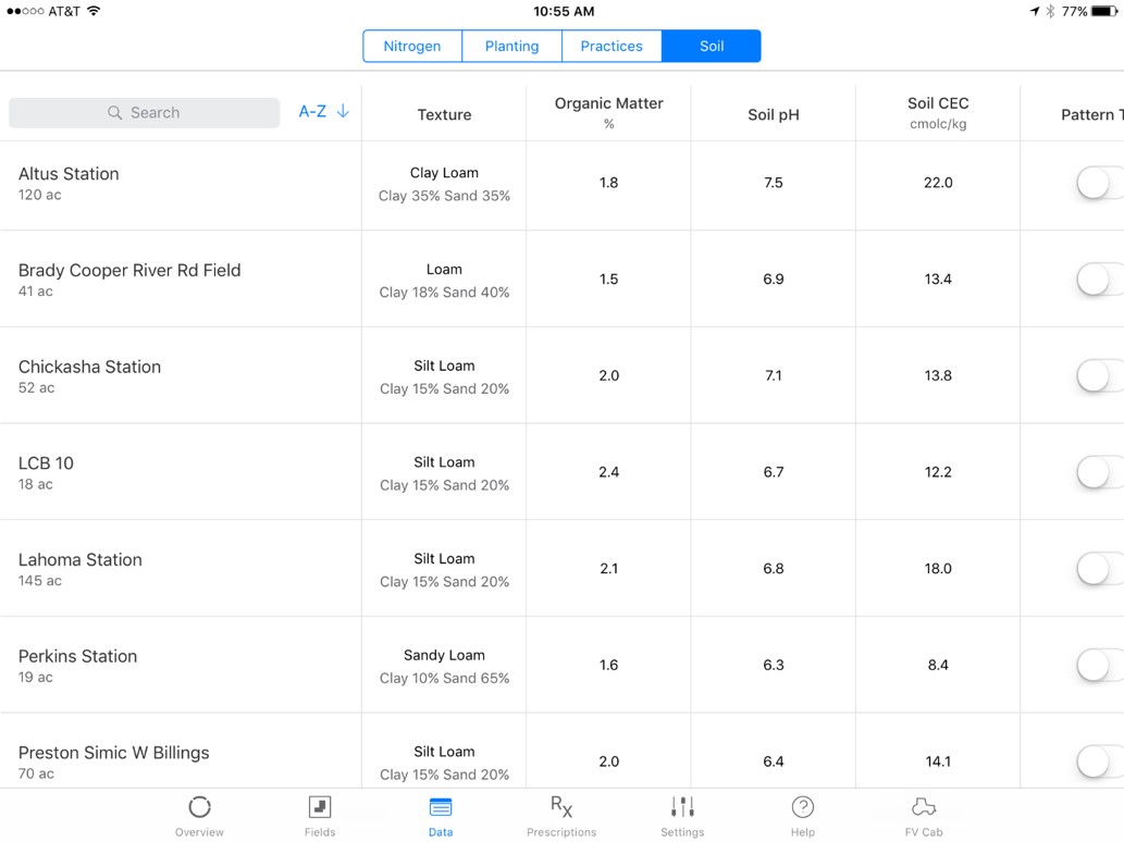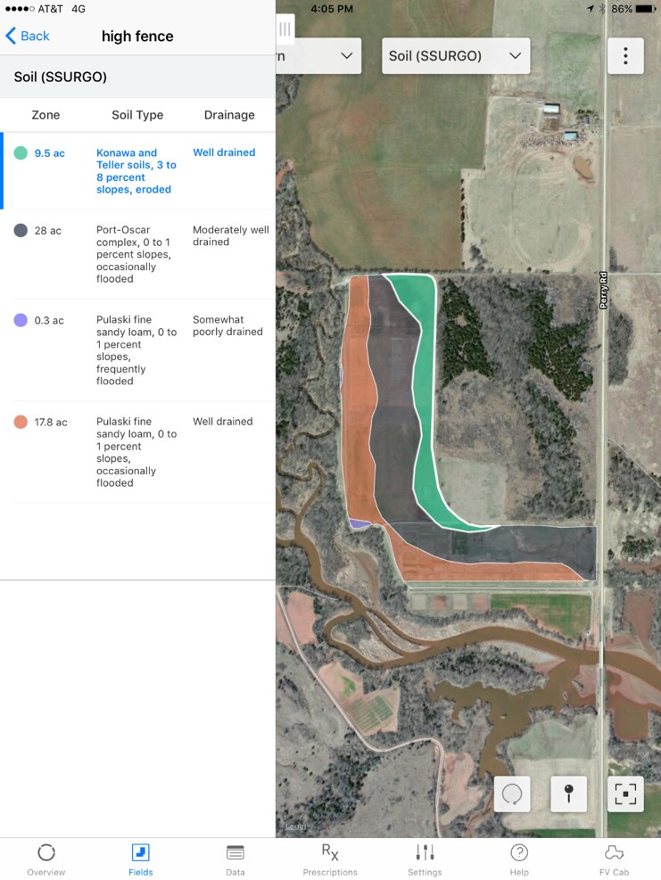 The next task I evaluated was entering crop/field information, such as crop type, variety/hybrid, planting date, fertilizer, and pesticide applications. My preference was that this task could be accomplished from the mobile device. As it turned out many of the applications which would function better for a larger organization did not allow for this information to be entered via the mobile device. Also, as a soil scientist, I was bummed by the lack of apps with the ability to bring in SURGO data, and even more let down that the majority of the desktop versions did not utilize this data layer. So, with that being said, a big props to FarmLogs for being the only mobile app with the capability of downloading SURGO data layers. Climate had an interesting “soils” portion of the app, where it provided a table listing predominate soil texture, percent organic matter, soil pH and CEC. A note on the Climate soils data, while the soil texture, OM, and CEC are not far off the average, I felt that the pH was off by a bit. This is not unexpected however as, of all the reported variables, pH is the most impacted by human activities.