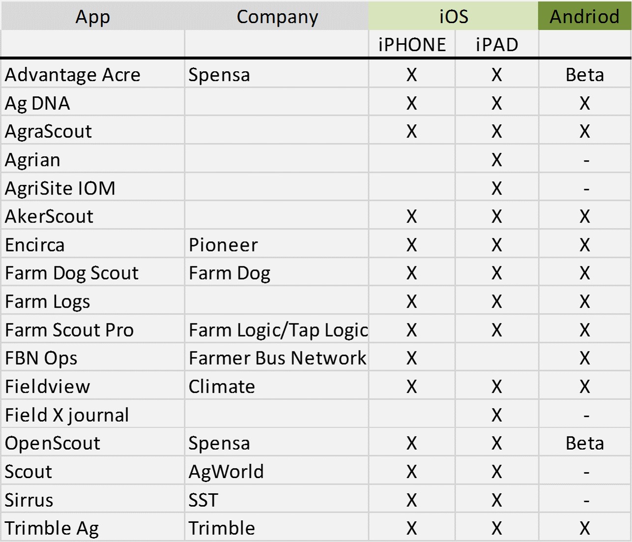 For 2017 InfoAG I was challenged to review the available mobile scouting apps. While I have been reviewing ag apps since the summer of 2013 https://osunpk.com/2013/07/30/agriculture-app-for-the-ipad-and-iphone/ , I had yet try to tackle a group as complex as scouting apps.My first challenge was to locate all relevant apps. My search began using social media and the search terms Crop Scouting, Field Scouting, Ag Scouting, and Farm Scouting for both iPhone and iPad apps. After a week-long hunt I had found around 30 apps, although I am sure I missed a few. As most of these app require payment, I assumed most would have a 30 day free-trial period. So towards the end of June, about a week out from the meetings, I started trying to gain access. As I did this I kept records in an excel file on how the process was going. I found that with nine apps I had immediate access via the app, for seven apps I was able to request a demonstration, and for another six I used the contact us option and requested a demo via that method. By Friday, July 21st, I had access to 17, my presentation was on Wednesday the 26th. I should note that a few more demos were provided after the presentation, but are not included in this review.