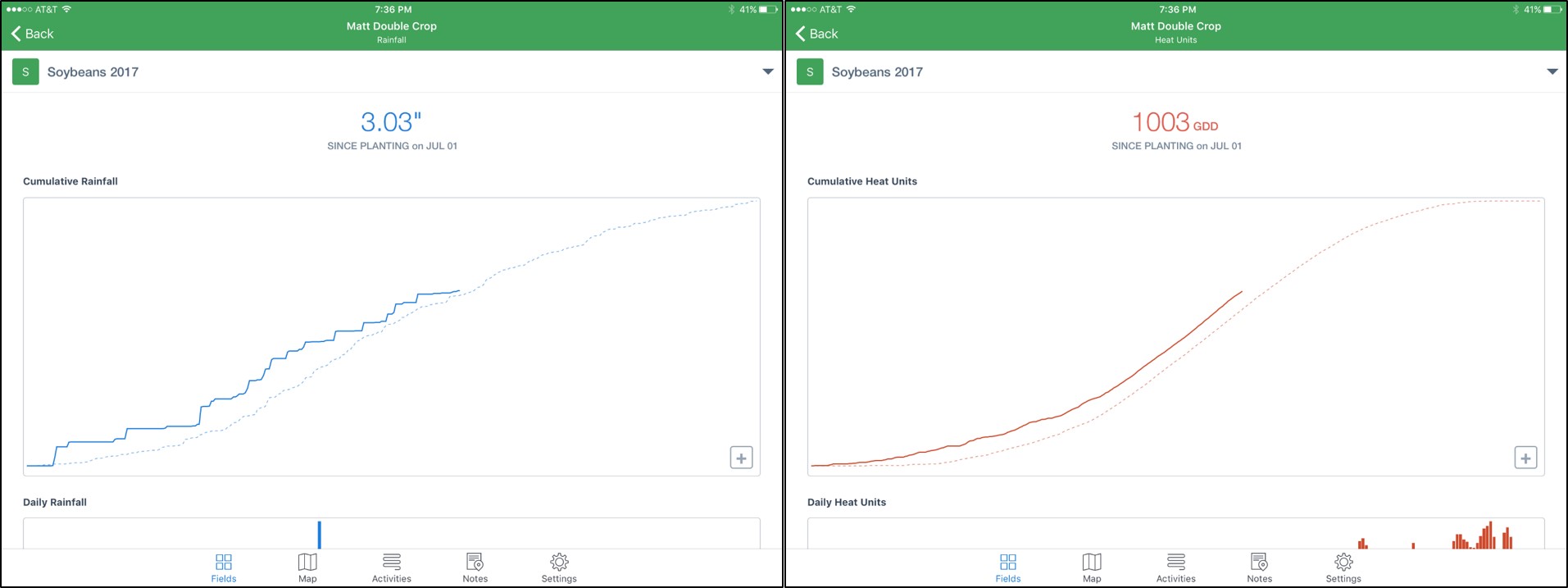 Climate provides current weather, hourly and 6 day forecast along with seasonal weather data based upon field planting date.