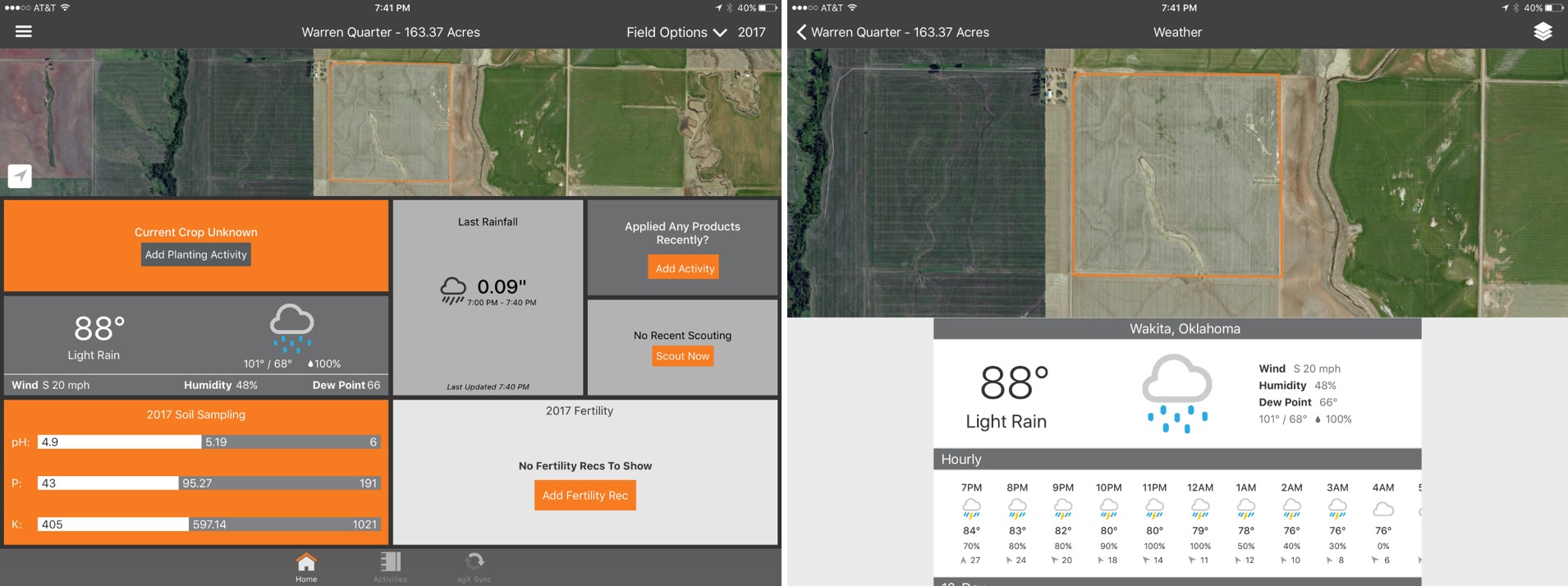 Sirrus shows current weather on the fields home screen with the option to look at hourly and 10 day forecast along with historical precip data.