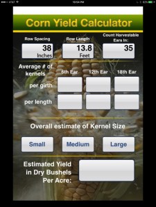 I like the easy of use for of the Corn Yield Calculator. It is a quick, easy, and clean way to estimate yield. However when I pulled the links for this app it seems as though since I first downloaded the app, a fee has been added, $2.99. For some of you it may be worth the charge. However University of Wisconsin has a nice app named Crop Calculators. It has several functions but the UI (user interface) is not as clean.