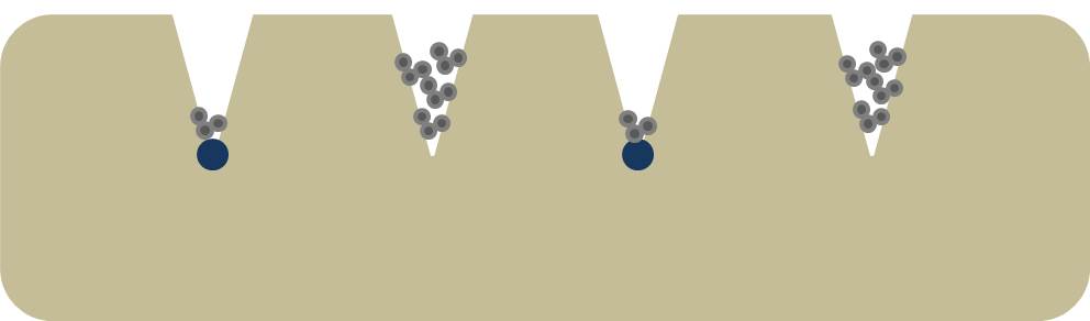 Seed, colored blue, is placed in every other row while fertilizer, dark grey circles, is placed in every row. In this scenario a high rate is placed in the row without seed.