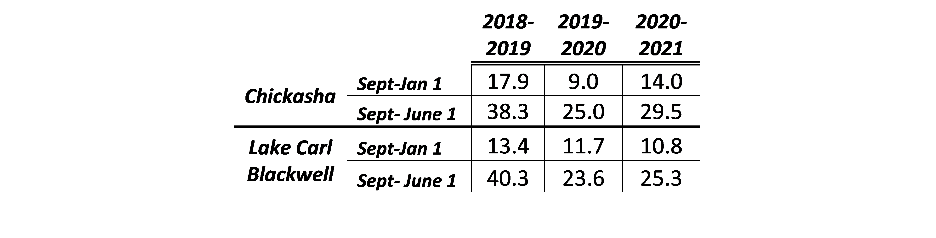 Crop production can be majorly impacted by the environment, and that is no different for a forage production system such as in this study. Table 1 shows the differences in rainfall totals for each growing season, and how much of that seasons total fell prior to January when hard freezing conditions typically occur. The 2018-2019 season saw at least 40% more rainfall than other years at both location. Much of this increase was in the fall and early winter which lead to a greater first harvest at both locations and greater soil moisture storage for after spring green-up. The environmental impacts continue to cause reduction in annual yields for the 2020-2021 season with a longer cool season and a late freeze (data not shown) which caused significant winter kill on what was a decent fall production.