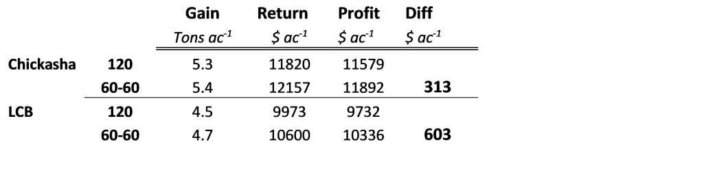 Table 2. Evaluation of Gain (dry matter yield * net energy for gain) in tons ac-1, Return (Gain * $1.12) in $ ac-1, Profit (Return minus fertilizer and application cost $241.03 for 120 and $264.49 for 60-60 split) and the Difference between the profit of 120 lbs of N applied preplant and the 60-60 split application.