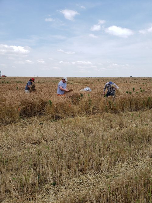 Figure 4. Crew hand harvesting on farm N rate plots. Hand harvest is preferred because A) we are able to harvest at a higher moisture content ahead of the farmers combines B) we do not have to haul the plot combine across the state.