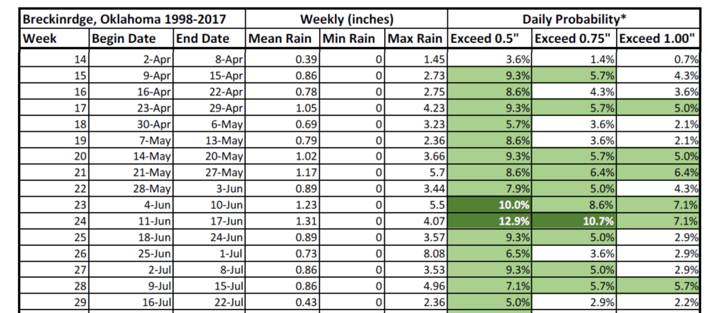 The loss in grain yield at Perkins in the pre-plant application could likely be reflective of nitrogen loss due to leaching. Pre-plant applications have been well documented in the aspect loss as a result of crop requirement and early physiological development. Long term mesonet rainfall data depicts a decline in the probability of rainfall with the progression of the growing season across all locations. In early season the probability of 0.5 inches of rainfall ranges from 8 to 10% respectively for LCB, Lahoma, and Perkins, and dramatically decline to percentages at low as 5% in mid-July during grain filling period. For Alva rainfall probability is substantially lower as its season was initiated during the drier months, which depicted a probability of 6% for 0.5 inches of rainfall, and 4.5% for 1 inch for early season rainfall crucial for pre-plant incorporation and crop establishment. These probabilities drop considerably compared to regular season as the months progress onward, mid to late August probability for 0.5 inches ranges from 0.8 to 11.5%, while for a 1 inch is 0 to 6.9%. Past weather data provided by the mesonet illustrates how later in the season rainfall and its amount is variable, suggesting that in a double crop scenario delayed application is not recommended while it is in regular season crop due to the increased chance of rainfall probability.