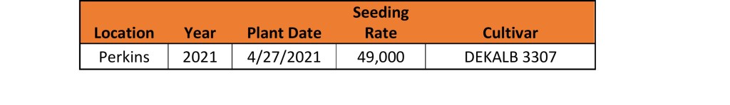This study was conducted over the 2020 growing season consisting four locations, including one double cropping system following wheat. Ten in-season applications were made using ammonium nitrate (AN) as the N source at a rate of 90 lbs. ac. Using AN as the N source reduced the risk of nitrogen loss through the process of volatilization as the goal of the research was to test the plant not the fertilizer. A pre-plant treatment served as the standard check, while in-season applications were initiated at 21 Days After Planting (DAP) and applications made sequentially at 7-day intervals. A non-fertilized check was included to the study to confirm locations were responsive to N fertilized applications Hybrid, plant date, and seeding rate can be found in Table 1.