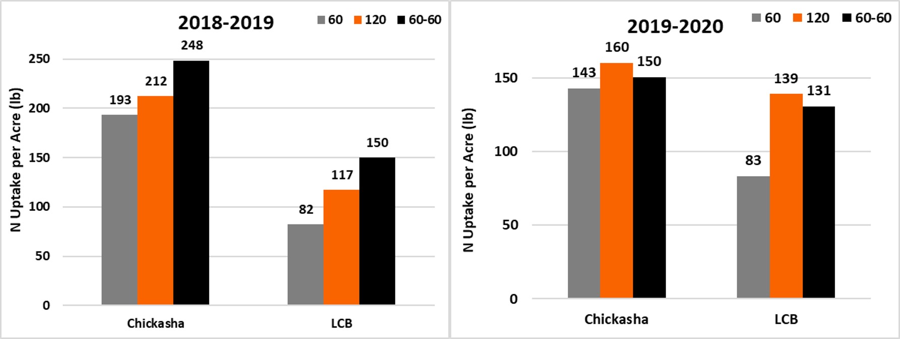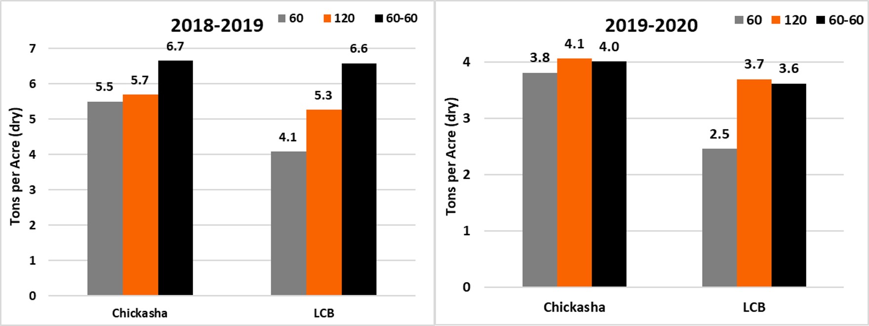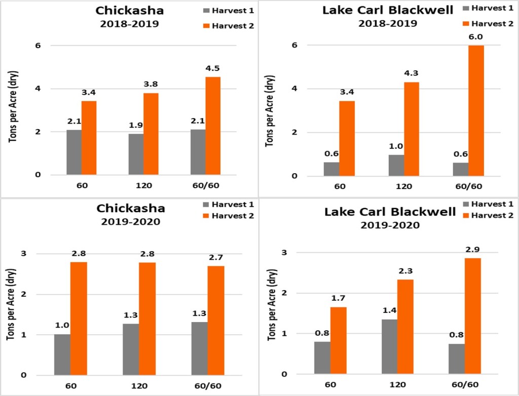 In 2018-2019 the additional 60 lb N applied in the 120 lb N pre-plant increased the dry biomass production in the second harvest by 0.4 and 0.9 tons per acre above the 60 lbs treatment at Chickasha and Lake Carl Blackwell, respectively (Figure 1). The delay of the additional 60 lbs of N increased the yield by an additional 0.7 and 1.7 tons per acre, respectively. The 2019-2020 season showed similar results at the Lake Carl Blackwell location in the second harvest, where the additional 60 lbs N at pre-plant increased biomass yield by 0.6 tons, with the delaying of the additional 60 lbs increasing biomass yield by 0.6 more as compared to the same rate when applied at pre-plant. But that additional yield gained with the split application came at cost as the 120 pre-plant resulted in 0.6 tons more in the first harvest. These results suggest that more N was needed in the pre-plant and top-dress application. The 2019-2020 Chickasha trial showed little difference in rate, more than likely 60 lbs N was enough maximize forage yield.