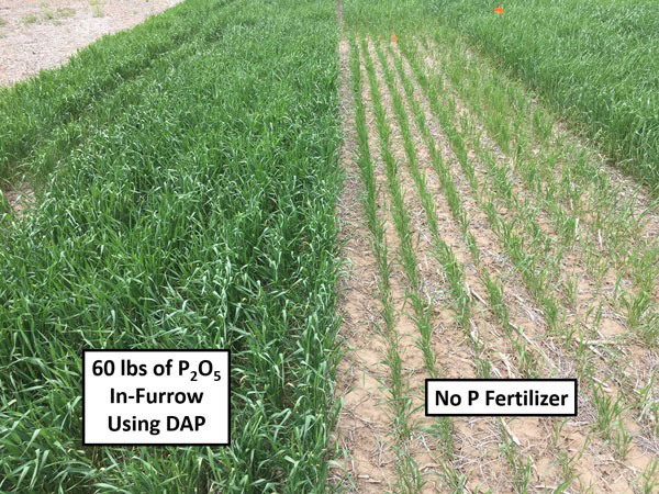 Although the wheat response to these in-furrow fertilizer products is primarily from the P, the small amount of N that is present in DAP, MAP, or 10-34-0 may also be important in some cases. If no pre-plant N was applied, and the soil has little or no carryover N from the previous crop, the N from these fertilizer products could benefit the wheat.