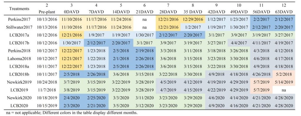 This study was started in the fall of 2016 and concluded with the 2020 wheat harvest. In all, twelve trials were established and achieved maturity. This study was designed to evaluate the recovery of winter wheat grain yield and protein after the crop was N stressed. Treatments included an untreated check, pre-plant application and ten in-season treatments. The application of in-season treatments was initiated when N deficiency was confirmed and treatments were applied in progressive order every seven growing days to the point of 63 growing days after visual deficiency (DAVD). A growing degree days is any day that the average daily temperature is at or above 40⁰ F. Ammonium nitrate (NH4NO3) was applied at a rate of 90 lbs N ac-1 for all treatments.