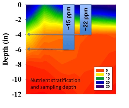 Figure 2. Consistency is sampling depth is particularly important for immobile nutrients like P. Stratification of nutrients and pH can be accentuated under reduced tillage.