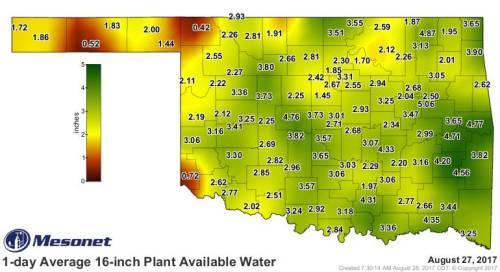 The 1-day Average 16-inch Plant Available Water map from http://www.mesonet.org. Accessed 8.28.17