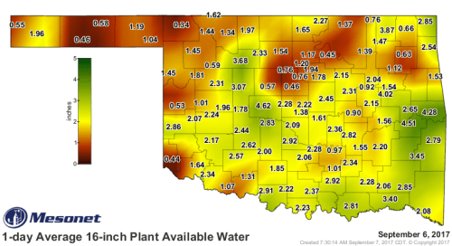 The 1-day Average 16-inch Plant Available Water map from http://www.mesonet.org. Accessed 9.07.17
