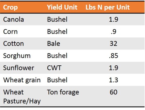 Pounds of nitrogen removed per one unit of yield harvested. These values are generalized averages and can change based on environment, management, and cultivar.