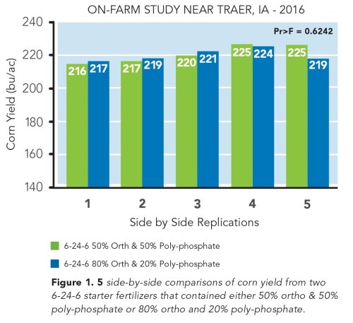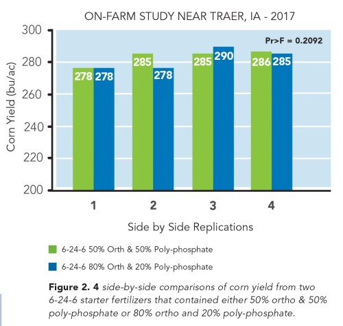- On-farm field studies conducted near Traer, IA in the 2016 and 2017 growing season found no statistical difference (Pr > 0.05) in corn yield between conventional and high ortho-phosphate starters in either year.
