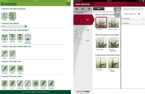 These are not the only Weed Identification apps, but they are my favorite. University of Missouri’s IDWeeds was the first of its kind and has made some fantastic improvements over the years. Monsanto’s WeedID app is, IMHO, one of the cleanest and nicest user interfaces available. Both function similarly, the user selects grass or broadleaf, then chooses the appropriate physiological features of the weed in question. A list of weeds fitting the description is compiled. Pictures and more in-depth descriptions are available.