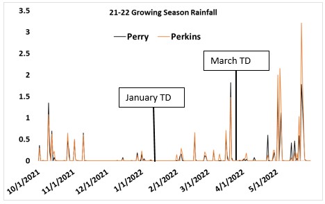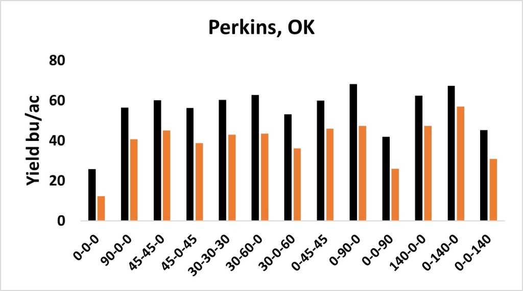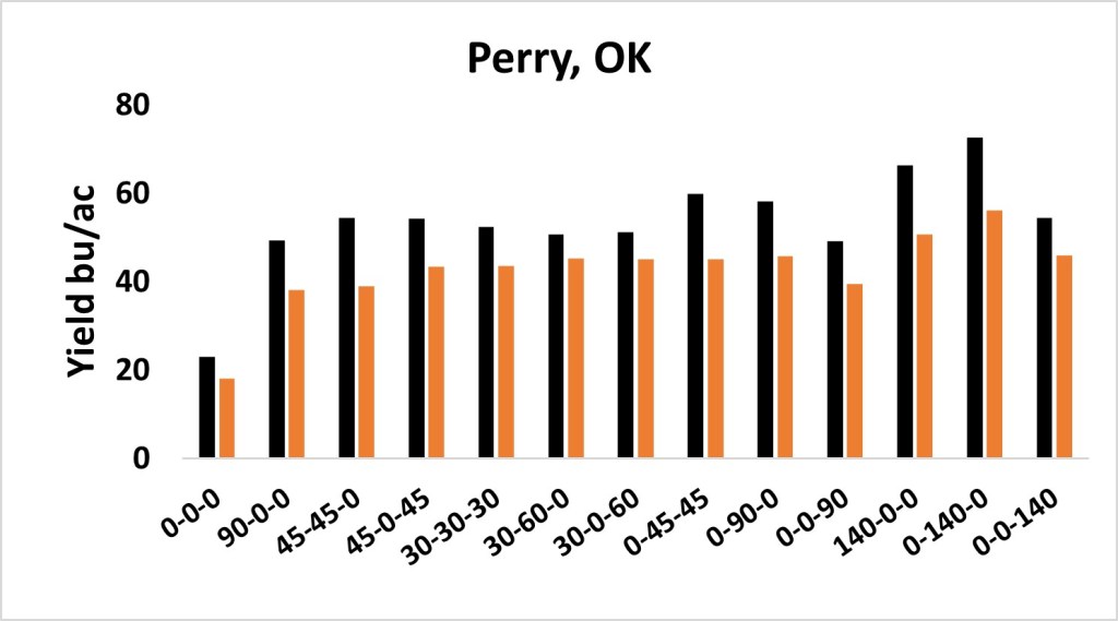 Often when talking about the past N timing results How Late Can You Wait there are comments about the risk of waiting and the crop needing N to get going. Most of the work in the past looked at a single application of N applied at different times and didn’t address split application. But the data from a couple of trials located at Perkins and Perry Oklahoma in the 21-22 season is reinforcing what the past data suggest. These trials consisted of 2 varieties with a 0 N check and 9 combinations of N timings to at 90lbs rate and 3 timings at 140 lbs. of N. Ammonium nitrate (34-0-0) was the N source used in this study to limit the impact of urea volatilization. For both locations we have pre-plant soil test results for the 0-6 and 6-12 inch depths. Both locations at about 30 lbs of total N and OM of 2.0% in the top 6 inches.